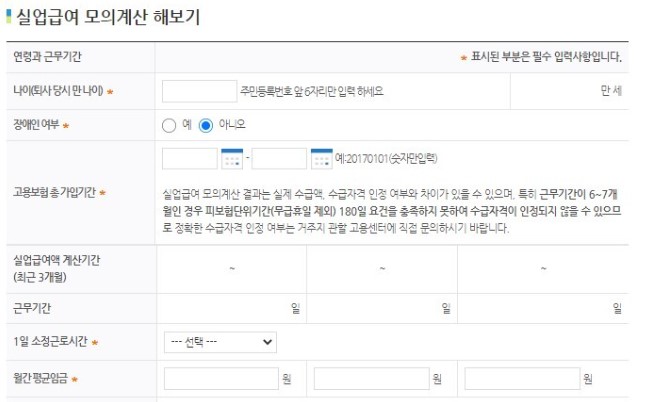 연령과 근무기간, 퇴사시 만 나이, 고용보험 총 가입기간, 근무기간, 월간 평균임금 등을 기입하시고 계산 해보시면 됩니다. 실업은 유쾌한 일이 아니지만, 실업급여를 수급하는 동안 더 좋은 직장을 꼭 찾으시길 바라겠습니다.