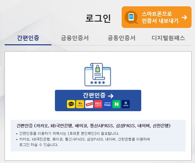 최근에는 간편인증이 활성화 되어 예전처럼 공인인증서를 준비하실 필요는 없습니다. 카카오, kb 국민은행, 페이코, 삼성pass, 네이버, 신한은행 등 본인이 이용하시는 것으로 간편인증을 진행하시면 됩니다.