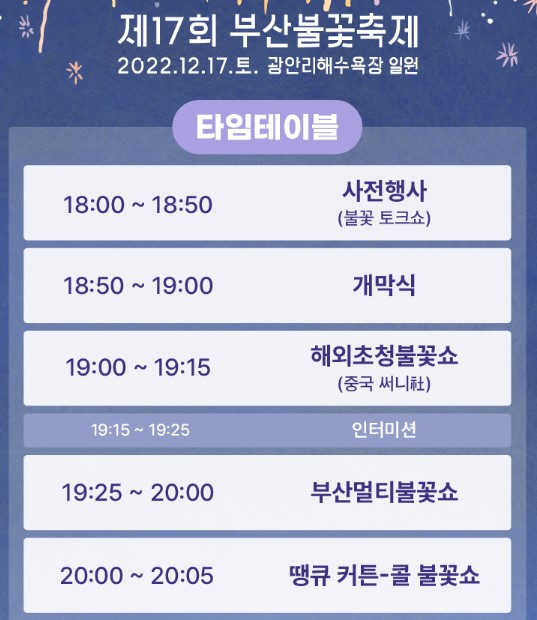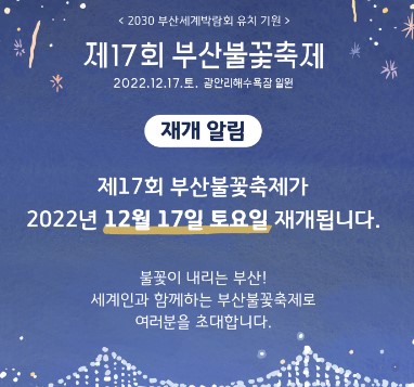 부산광역시에서 개최하는 이번 행사는 제17회 부산 불꽃축제로 12월 17일 광안리 해수욕장과 남구 이기대 앞, 해운대 동백섬에서 열립니다. 이번 축제는 부산 하모니를 주제로 열리며 COVID 19로 지친 시민의 마음을 위로하고, 2030부산세계박람회 유치 기원을 홍보하는 자리로 마련되었는데 정상적으로 열리는 것은 3년 만이라고 합니다.