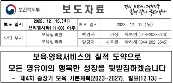 보건복지부에서는 12월 13일 중앙보육정책위원회를 열고 '제4차 중장기 보육 기본계획'을 확정했다고 밝혔는데 주요 내용을 살펴 보겠습니다.