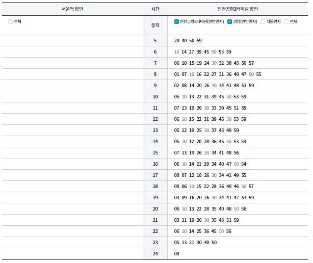 그렇다면 공항철도 시간표는 어떻게 구성되어 있을까요? 아래를 참고하시면 됩니다. 서울역에서 인천공항 2 터미널 방면 첫차는 5시 20분, 막차는 24시입니다.