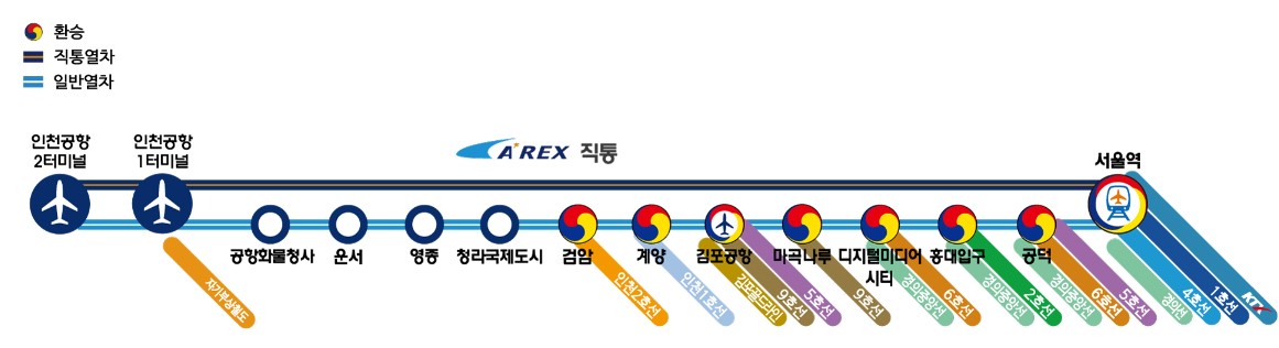 그렇다면 공항철도 노선도는 어떻게 될까요? 서울역과 인천국제공항을 무정차로 운행하는 직통열차와 공항철도 14개 역에 모두 정차하는 통근형 열차로 구분됩니다. 공항철도 14개 역은 서울역, 공덕역, 홍대입구역, 디지털미디어시티역, 마곡나루역, 김포공항역, 계양역, 검암역, 청라국제도시역, 영종역, 운서역, 공항화물청사역, 인천공항 1 터미널, 인천공항 2 터미널로 구성이 되는데, 각 역마다 정차하는 통근형 열차보다는 무정차로 운행이 되는 직통열차를 이용하신다면 조금 더 편하게 인천공항을 방문할 수 있습니다.