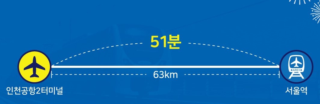 서울역에서 인천공항 2 터미널까지는 약 63km로 51분가량 소요가 됩니다.